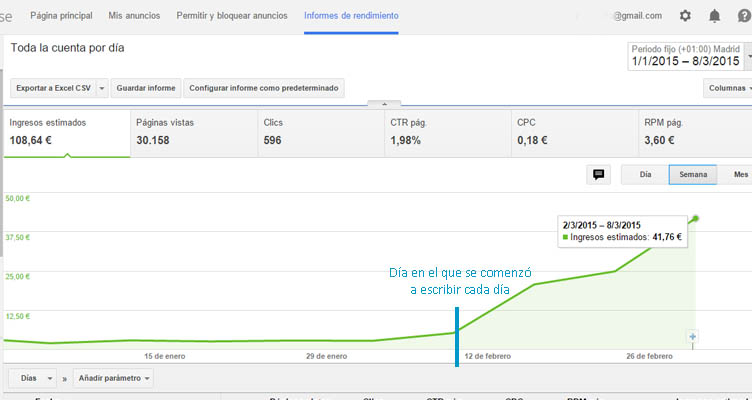 Pero es que justo una semana después de empezar a crear nuevo contenido, si solo habían pasado 7 días… 5,37 euros!! Y durante este tiempo la medía ha sido de 5,50€ incluso un día sobrepaso los 10 euros diarios.