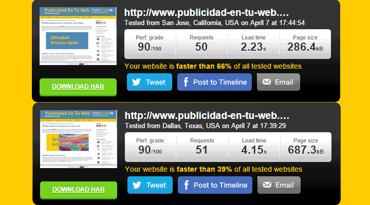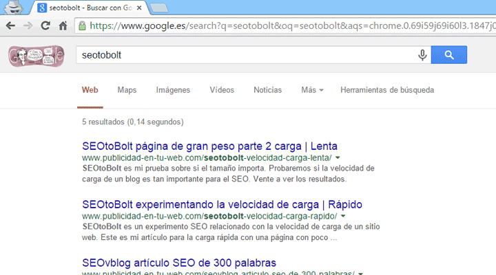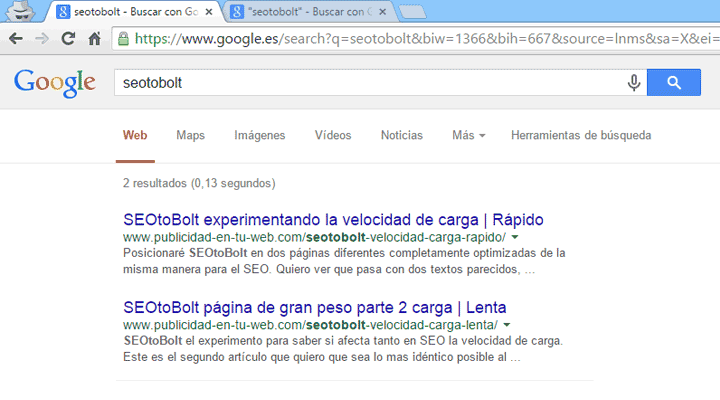 Los resultados han sido los siguientes, en primera posición ha aparecido la página de carga rápida y seguidamente la lenta, no habían más resultados 😛