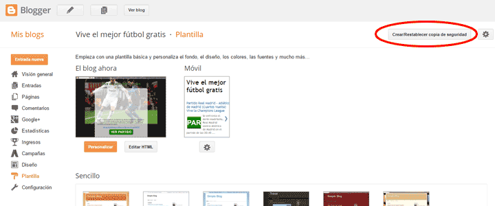 Lo siguiente que vamos a hacer es subir la plantilla al blog, es el archivo «landing-futbol.xml». Para subirlo vamos a plantilla que aparece en el menú izquierdo una vez entramos en el escritorio de nuestro blog.